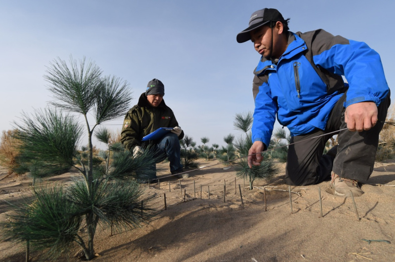▲2016年11月21日,在巴丹吉林沙漠東南緣的民勤沙生植物園,甘肅省民勤治沙綜合試驗(yàn)站工作人員在仿真固沙灌木固沙試驗(yàn)區(qū)測量固沙數(shù)據(jù)。