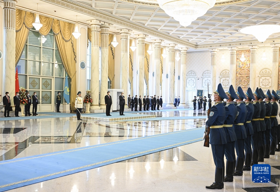國(guó)家主席習(xí)近平出席哈薩克斯坦總統(tǒng)托卡耶夫在總統(tǒng)府舉行的隆重歡迎儀式。新華社記者殷博古攝