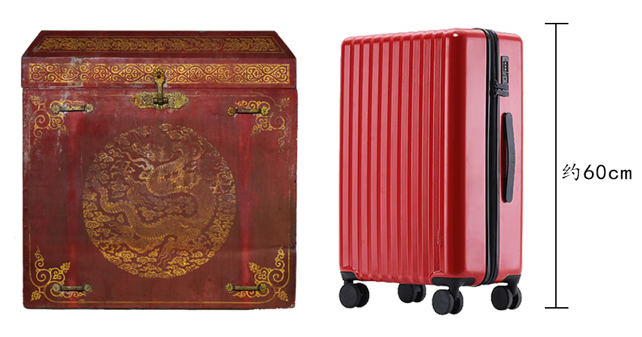 △ 戧(qiàng)金云龍紋朱漆盝(lù)頂箱與一個24寸行李箱的高度差不多