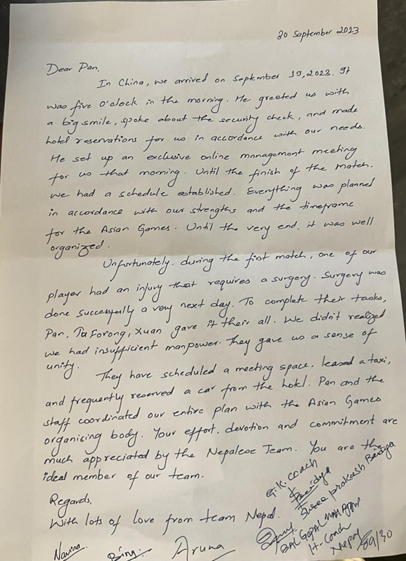 9月30日,尼泊爾女足隊結(jié)束了在溫州12天的行程,臨行前,他們向NOC助理團隊送上一封手寫感謝信,高度贊揚了NOC助理的服務。10月3日,龍舟賽事技術(shù)會議舉行。會后收到了泰國籍ITO的感謝信,贊揚了“小青荷”周全、細致、熱情的服務。