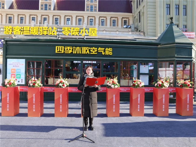 四季沐歌集團(tuán)總裁李駿在儀式講話中指出,此次將溫暖驛站升級(jí)為溫暖驛站零碳小屋,一是希望全方位發(fā)揮窗口示范作用,以熱情周到的服務(wù)為每一位游客驅(qū)散寒意、送上暖意;二是為踴躍投身公益的青年志愿者搭建平臺(tái),公益之心在此匯聚;三是將其作為廣大青少年探索環(huán)保知識(shí)、踐行低碳理念的科普實(shí)踐基地,將哈爾濱整座城市堅(jiān)持綠色低碳發(fā)展的理念傳至五湖四海。