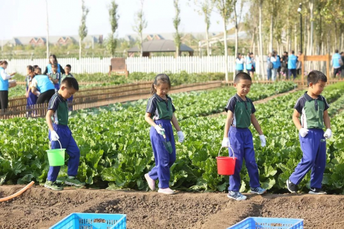 △ 北京景山學(xué)校香河分校學(xué)生在農(nóng)場體驗(yàn)耕種樂趣