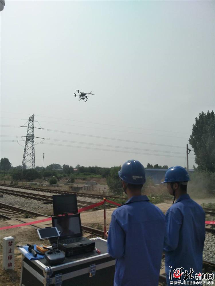 圖為巡線(xiàn)員正在使用無(wú)人機(jī)巡線(xiàn)。