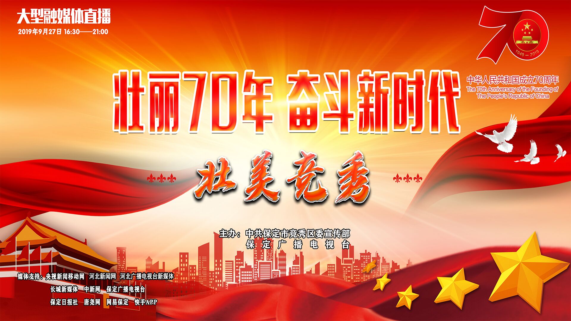 壯麗70年, 奮斗新時(shí)代,由中共保定市競(jìng)秀區(qū)委宣傳部、保定廣播電視臺(tái)聯(lián)合推出的大型融媒體直播節(jié)目——“壯美競(jìng)秀”今天與您見(jiàn)面。屆時(shí),央視新聞移動(dòng)網(wǎng)、長(zhǎng)城新媒體、河北新聞網(wǎng)、中新網(wǎng)、保定廣播電視臺(tái)手機(jī)臺(tái)、保定廣播電視臺(tái)“在保定”APP、保定廣播電視臺(tái)公共頻道“保定創(chuàng)城”微信公眾號(hào)、保定日?qǐng)?bào)社、唐堯網(wǎng)、網(wǎng)易保定、快手APP十二家網(wǎng)絡(luò)媒體平臺(tái)進(jìn)行同步直播。16點(diǎn)半至21點(diǎn)半,五個(gè)小時(shí)、七個(gè)地點(diǎn)的不間斷直播,將為您展現(xiàn)競(jìng)秀區(qū)時(shí)代發(fā)展的強(qiáng)勁脈搏!
