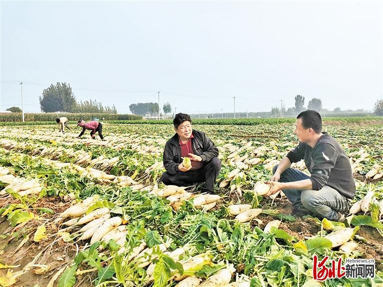 10月10日,在定興縣南大位村,村網(wǎng)格指導(dǎo)員、黨支部書(shū)記鄭林亭(右二)在向菜農(nóng)了解白蘿卜收獲、銷(xiāo)售等情況,并幫他謀劃下一步發(fā)展方向。該村是蔬菜種植專(zhuān)業(yè)村,在基層治理網(wǎng)格化管理中,該村注重幫助菜農(nóng)解決種植和銷(xiāo)售難題。通訊員李航攝