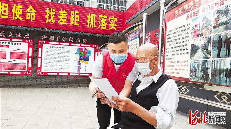 日前,定興縣北堽上村網(wǎng)格員張忠(左)在為村民講解環(huán)保政策。通訊員李航攝