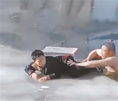 2月16日,記者電話采訪了救人視頻中的主角——37歲的王蘭溝村村民王磊。據(jù)王磊介紹,當(dāng)天上午10時(shí)許,他正準(zhǔn)備開(kāi)車出門辦事,突然間,聽(tīng)到河邊傳來(lái)救人的呼喊聲。從小在河邊長(zhǎng)大的王磊,意識(shí)到可能有人掉河里了,于是第一時(shí)間往河邊跑!拔遗艿胶舆叺臅r(shí)候,看見(jiàn)河里有個(gè)大黃球,有個(gè)小孩在河里扒著冰,大聲喊叫著,眼看著就堅(jiān)持不住了,我趕緊脫了衣服下水。這段河深的地方兩三米,我知道從哪兒可以繞過(guò)水深的地方……”王磊稱,他下河的地方距離孩子大概有10多米,一路破冰連走帶游到孩子身邊,把孩子帶回來(lái)推上了岸邊的冰面,隨后才上岸。