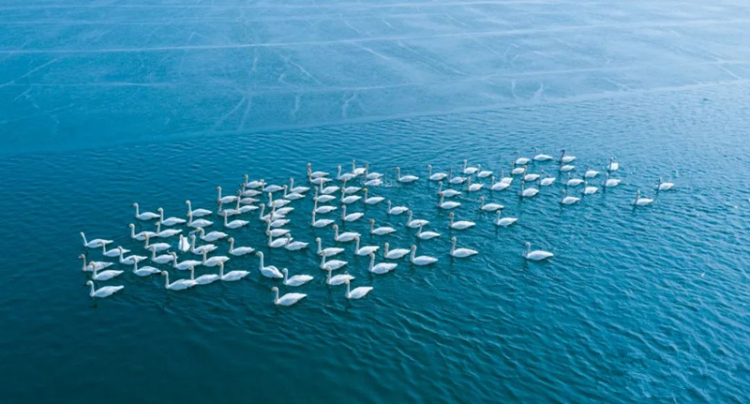 在易縣民間攝影師楊增紅提供的照片里,藍天之下的旺隆湖碧水一片,靜謐恬淡。在這片俯瞰如心型的湖泊里,一群潔白的天鵝如點綴其間的精靈,給平靜如畫的水面增加了一抹靈動。