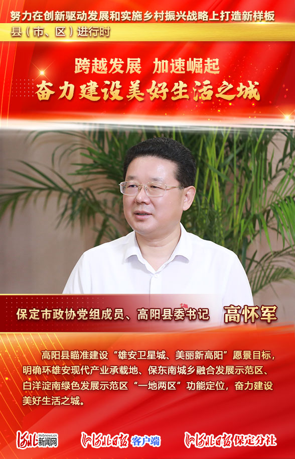 “黨的二十大報告對推動高質量發(fā)展作出一系列戰(zhàn)略部署,給我們推動高質量發(fā)展各項工作提供了根本遵循。認真學習貫徹黨的二十大精神,按照省委十屆三次全會的安排部署,高陽縣確定了凝心聚力推動高陽跨越發(fā)展、加速崛起的行動目標!苯,保定市政協(xié)黨組成員、高陽縣委書記高懷軍在接受本報記者采訪時表示,今年,該縣謀劃細化279項具體工作,強化以任務、措施、責任、時限為一體的“四明確一督導”,努力建設“雄安衛(wèi)星城,美麗新高陽”。