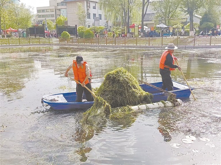 環(huán)衛(wèi)工人乘漁船,清理拒馬源廣場水面垃圾及水草。