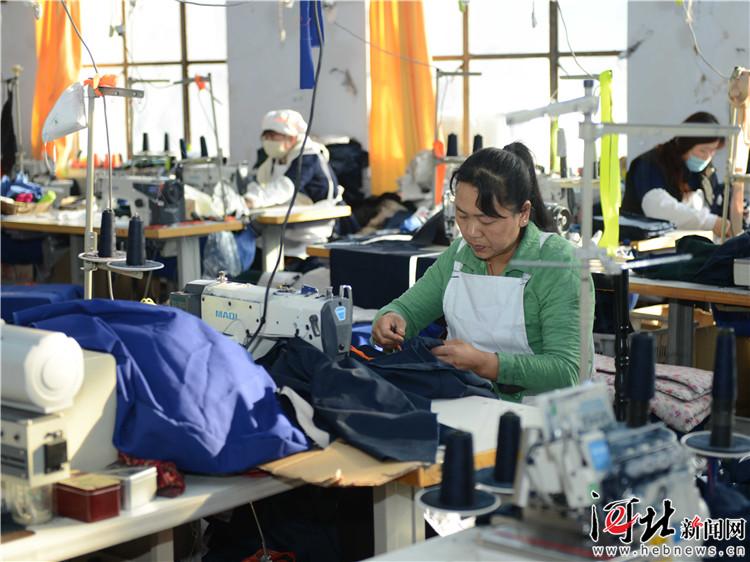 近日,姚家莊村村民在承德卓尚服飾有限公司的服裝加工車間縫制工裝。通訊員王曦攝