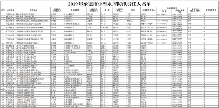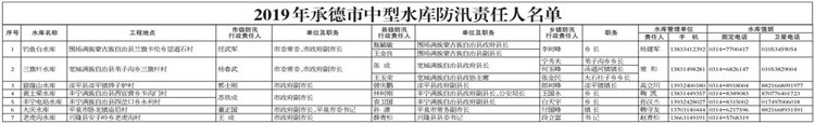 根據(jù)《中華人民共和國防洪法》規(guī)定,承德市防汛抗旱指揮部于6月1日通報了全市水庫防汛行政責任人及單位責任人名單(詳見下表),接受社會監(jiān)督,旨在落實以行政首長負責制為核心的各項防汛責任制,做好承德市
