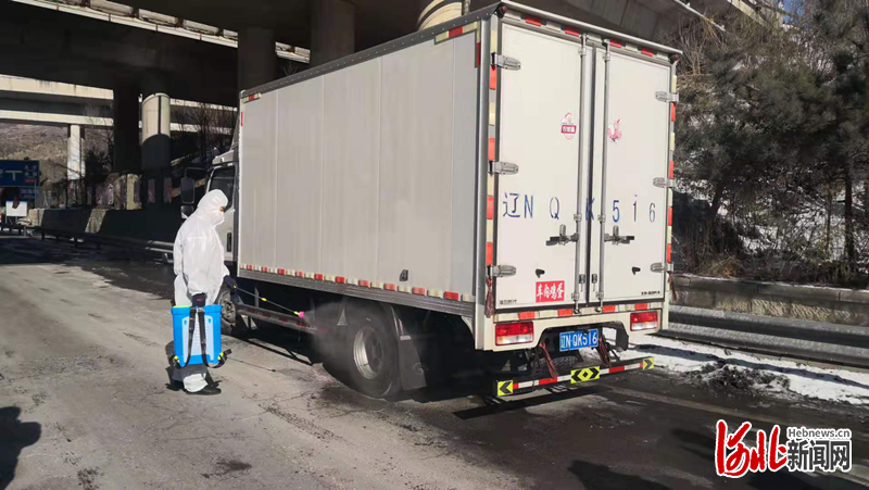 圖為工作人員在對(duì)運(yùn)輸車(chē)輛進(jìn)行消殺。  承德市農(nóng)業(yè)農(nóng)村局供圖
