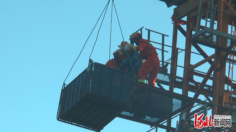 16時26分左右,消防人員到達事故現(xiàn)場。經(jīng)了解得知,一輛混凝土泵車在向高空輸送混凝土時管路炸裂,由于管路壓力較大,噴灑出來的混凝土與管道殘壁猛烈撞擊到附近的一座塔吊駕駛室,塔吊內的操作員由于過度驚嚇而全身無力,無法作業(yè),被困在駕駛室內。得知情況后指揮員迅速下達作戰(zhàn)命令,由指揮員帶領兩名隊員乘坐吊籠上到塔吊頂部對被困人進行救助,到達塔吊頂部發(fā)現(xiàn)被困人并無明顯外傷,為防止發(fā)生意外指揮員首先為被困人系好安全繩和腰帶,做好安全防護。隨即利用繩索將被困人轉移到吊籠內部,并帶到地面。經(jīng)過大約20分鐘的緊張救援,被困人被成功送上救護車。