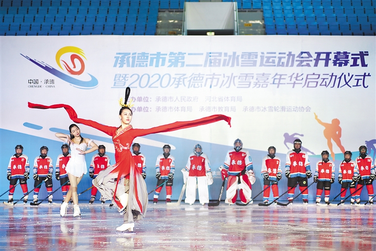 11月28日,在承德市第二屆冰雪運動會暨2020承德市冰雪嘉年華活動開幕式上,演員在表演冰舞。河北日報記者陳寶云攝