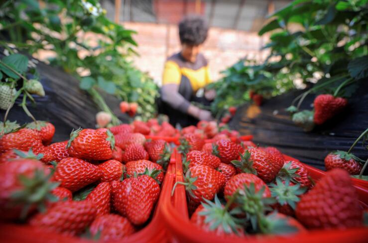 12月26日,在承德市雙灤區(qū)偏橋子鎮(zhèn)一處草莓采摘園,游客在采摘草莓。
