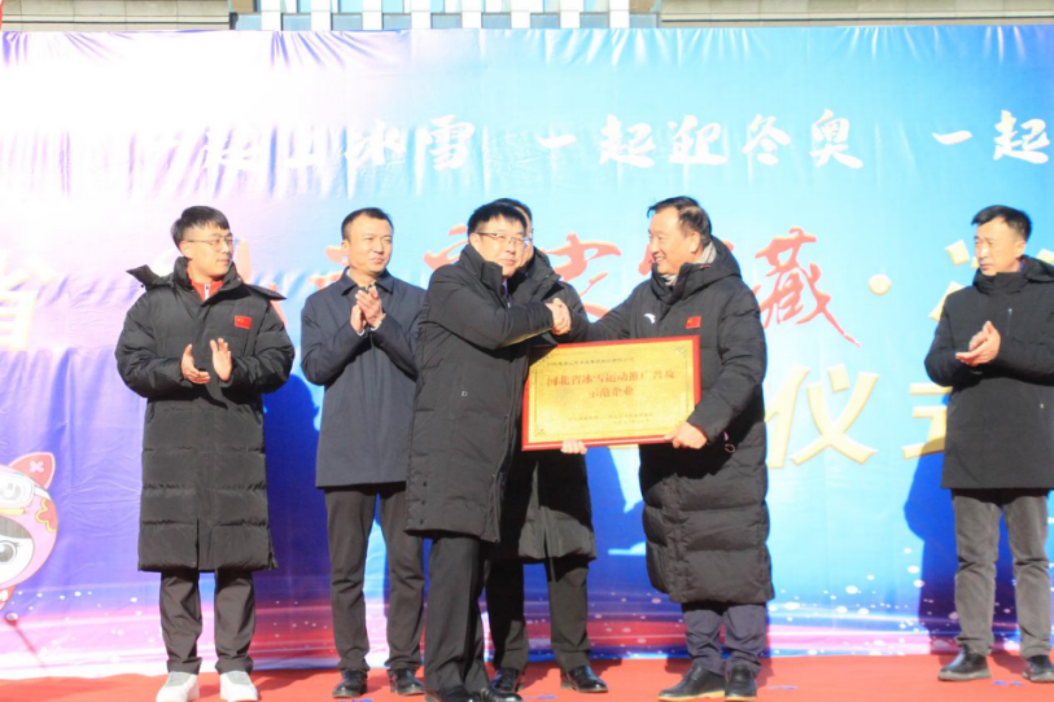 在發(fā)車儀式上,,河北省體育局領(lǐng)導(dǎo)為冰雪運(yùn)動示范單位山莊集團(tuán)頒發(fā)牌匾,參會領(lǐng)導(dǎo)和河北省冰雪運(yùn)動推廣大使向企業(yè)“冰雪大篷車”車隊(duì)隊(duì)長授旗。