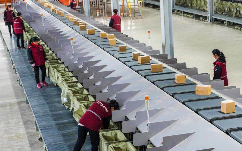 3月19日,棗強(qiáng)縣肖張鎮(zhèn)一家物流公司的工人在快遞包裹分揀流水線上作業(yè)(無(wú)人機(jī)拍攝)。 新華社記者李曉果攝