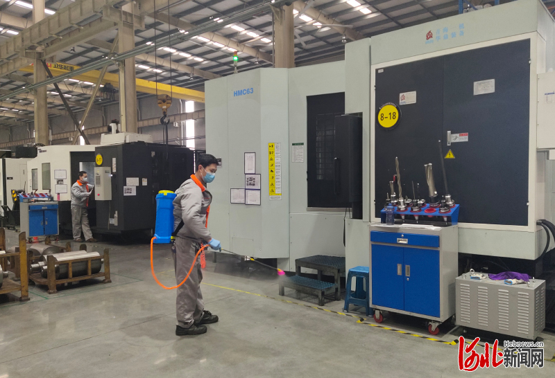 圖為成安縣河北恒工機械公司職工在車間進行消毒作業(yè)。