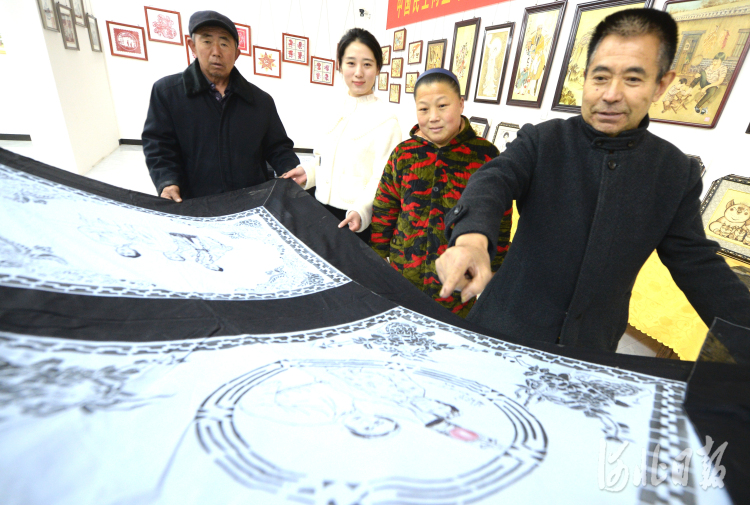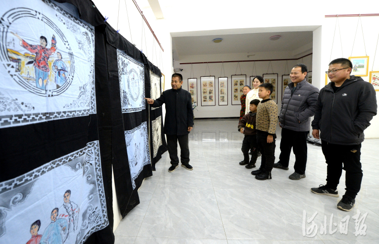 近日,河北省邱縣民間藝人王成林為參觀者講解門簾制作過程。河北日報記者杜柏樺攝影報道
