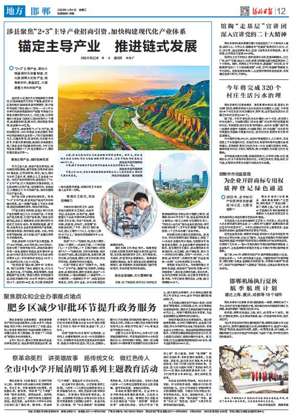 近年來(lái),涉縣聚焦“2+3”主導(dǎo)產(chǎn)業(yè),狠抓招商引資,2022年該縣在重點(diǎn)項(xiàng)目考核中位列縣域排名全省第一!拔覀儓(jiān)持項(xiàng)目為王,以鏈?zhǔn)骄奂⑼晟茩C(jī)制、優(yōu)化服務(wù)為抓手,積蓄發(fā)展新動(dòng)能,推動(dòng)經(jīng)濟(jì)高質(zhì)量發(fā)展。”涉縣縣委書(shū)記董路明介紹,今年已爭(zhēng)列省重點(diǎn)項(xiàng)目7個(gè)、市重點(diǎn)項(xiàng)目24個(gè),項(xiàng)目數(shù)量位居全市第一。