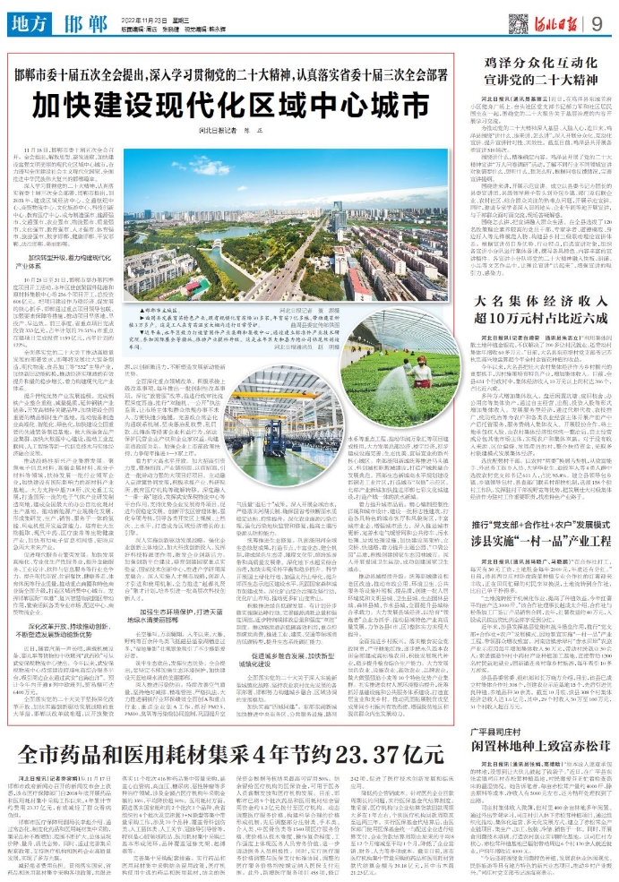 深入學(xué)習(xí)貫徹黨的二十大精神,認(rèn)真落實(shí)省委十屆三次全會(huì)部署,邯鄲市提出,到2035年,建成區(qū)域經(jīng)濟(jì)中心、交通樞紐中心、商貿(mào)物流中心、文化旅游中心、科技創(chuàng)新中心、教育醫(yī)療中心,成為制造強(qiáng)市、能源強(qiáng)市、交通強(qiáng)市、農(nóng)業(yè)強(qiáng)市、物流強(qiáng)市、質(zhì)量強(qiáng)市、文化強(qiáng)市、教育強(qiáng)市、人才強(qiáng)市、體育強(qiáng)市、旅游強(qiáng)市、數(shù)字邯鄲、健康邯鄲、平安邯鄲、法治邯鄲、美麗邯鄲。