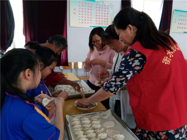 故城縣坊莊小學(xué)留守兒童快樂家園的孩子們和衡水市愛心聯(lián)合會的志愿者一起包餃子。