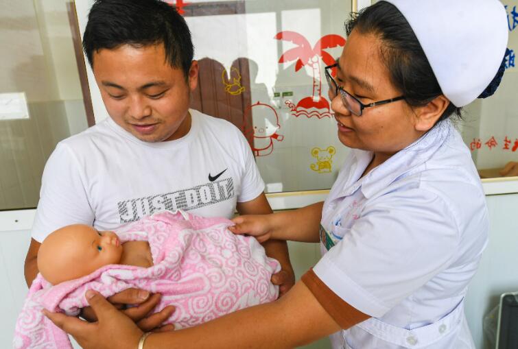 當(dāng)日是父親節(jié),河北省衡水市武邑縣人民醫(yī)院開展“新爸學(xué)育嬰 迎接父親節(jié)”主題活動。新爸爸在婦產(chǎn)科醫(yī)護(hù)人員指導(dǎo)下,學(xué)習(xí)給嬰兒洗澡、穿衣、喂水等,掌握有關(guān)育嬰方面的護(hù)理知識和技能。 新華社記者李曉果攝