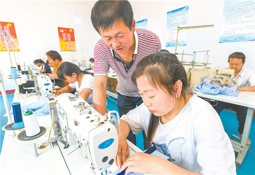 6月17日,工作人員在河北省武強(qiáng)縣豆村鄉(xiāng)豆村的扶貧車間里加工服裝。
