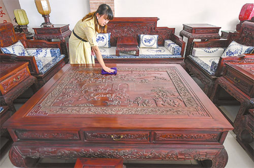 圖為4日,武邑縣一硬木雕刻家具企業(yè)工人在擦拭硬木雕刻家具。