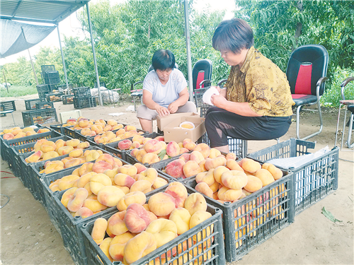 安平縣大子文鎮(zhèn)北郝村地處滹沱河中下游南岸,具有獨(dú)特的土質(zhì)、雨水少、高光照,適宜種植林果。近年來(lái),該鎮(zhèn)大力發(fā)展庭院經(jīng)濟(jì)和林果經(jīng)濟(jì),拓寬了村民的致富路,其中北郝村農(nóng)民張漢賓種植果樹(shù)類200畝,素有“黃金蟠桃”之稱的蟠桃樹(shù)30余畝,畝產(chǎn)量可達(dá)2500公斤。圖為漢濱果園農(nóng)民在將摘下的“黃金蟠桃”裝箱發(fā)貨。張佳攝