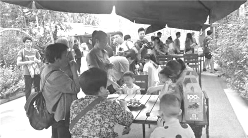 在葡萄園,葡萄回廊小道上設置了一個個平臺,平臺上放著洗好的水果。人們品嘗著葡萄、蟠桃、蘋果、蜜桃,還不停地拍照,留住時光倩影。