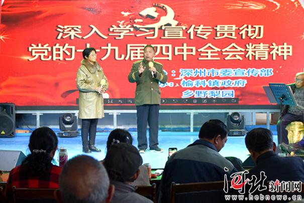 11月13日,深州市鄉(xiāng)野梨園文化大院舉行深入學(xué)習(xí)宣傳貫徹黨的十九屆四中全會(huì)精神主題文藝匯演。記者焦磊 通訊員高占峰攝