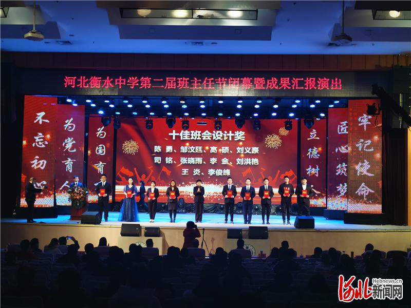 活動(dòng)現(xiàn)場(chǎng),學(xué)校為十佳班會(huì)設(shè)計(jì)獎(jiǎng)、十佳德育論文獎(jiǎng)、十佳才藝展示獎(jiǎng)、魅力班主任等教師頒獎(jiǎng),并授予在衡中擔(dān)任班主任工作滿30年且至今依然在崗的楊廣杰教師“鑄魂”紀(jì)念獎(jiǎng)杯;授予在衡中擔(dān)任班主任工作滿20年且至今依然在崗的閆文國(guó)、張桂安、盧洪濤、陳鐵亂、張華、國(guó)列通、王寶樹、馬孟龍、鄭立新、王民雄、封秋鋒11位教師“明向”紀(jì)念獎(jiǎng)杯。獲得“十佳才藝展示”的班主任張倩說:“進(jìn)入衡中已經(jīng)兩年有余,收獲頗多,我愿意用余生扎根衡中這片沃土,育天下桃李,盡享桃李芬芳!