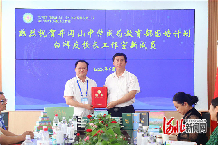 圖為教育部“國(guó)培計(jì)劃”白祥友校長(zhǎng)工作室主持人、衡水市教育局督學(xué)兼衡水市第十三中學(xué)黨委書記白祥友(右)向江西省井岡山中學(xué)黨總支書記謝建國(guó)(左)頒發(fā)聘書。通訊員侯雪燕攝