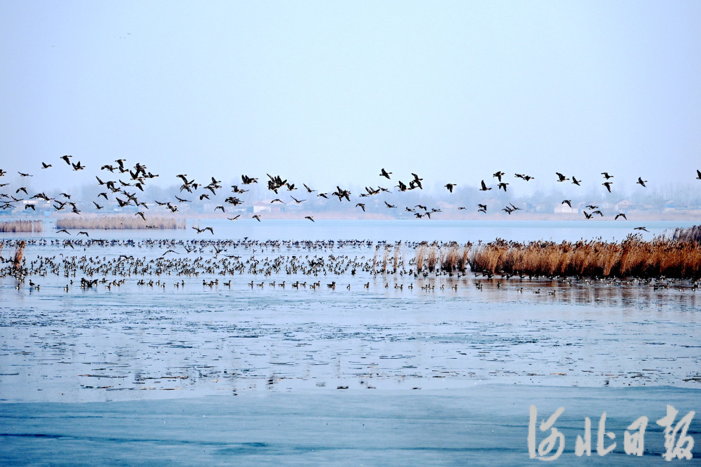 2月9日,衡水湖,成群的豆雁或水中覓食,或振翅高飛。河北日報(bào)記者焦磊攝