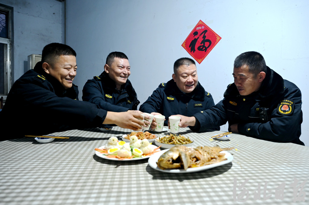 2月9日,衡水濱湖新區(qū)綜合管理局執(zhí)法隊(duì)員徐偉、趙保、馬占強(qiáng)、孫丙言(從左到右)在一起吃年夜飯。河北日報(bào)記者焦磊攝