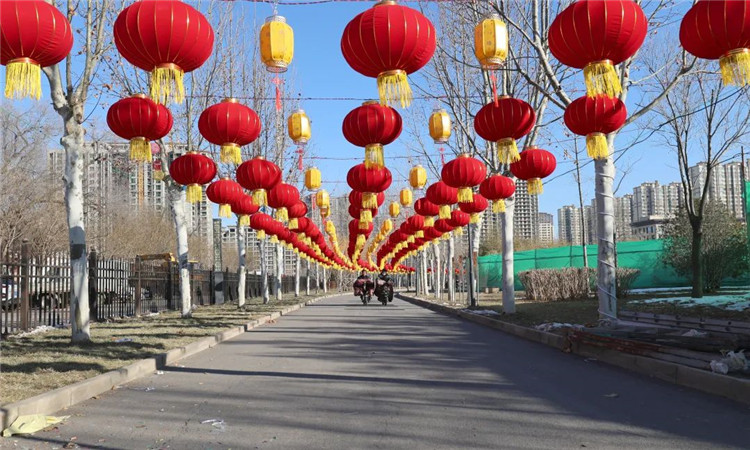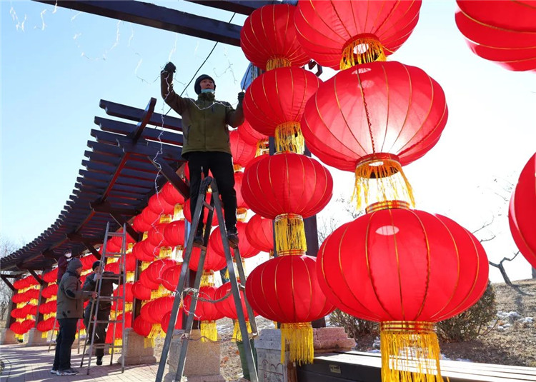 記者來(lái)到公園風(fēng)雅文化園區(qū),遠(yuǎn)遠(yuǎn)看到工人們冒著嚴(yán)寒,正在進(jìn)行燈籠的安裝和調(diào)試。在古詩(shī)詞長(zhǎng)廊區(qū),長(zhǎng)廊一側(cè)已經(jīng)掛滿紅彤彤的燈籠,中間搭配著亮化古詩(shī)詞。待夜幕降臨,燈火闌珊,樹(shù)木為骨,詩(shī)詞為魂,百余組詩(shī)詞燈籠如熒熒流星,裊娜懸于空中,在唯美的氛圍中感受傳統(tǒng)文化的魅力。該燈組高4米,長(zhǎng)45米,目前已經(jīng)完成80%的安裝進(jìn)度。