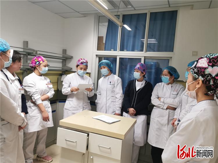 固安縣總醫(yī)院護(hù)士長肖永紅(左五)出發(fā)去抗疫一線前與同事交接工作。