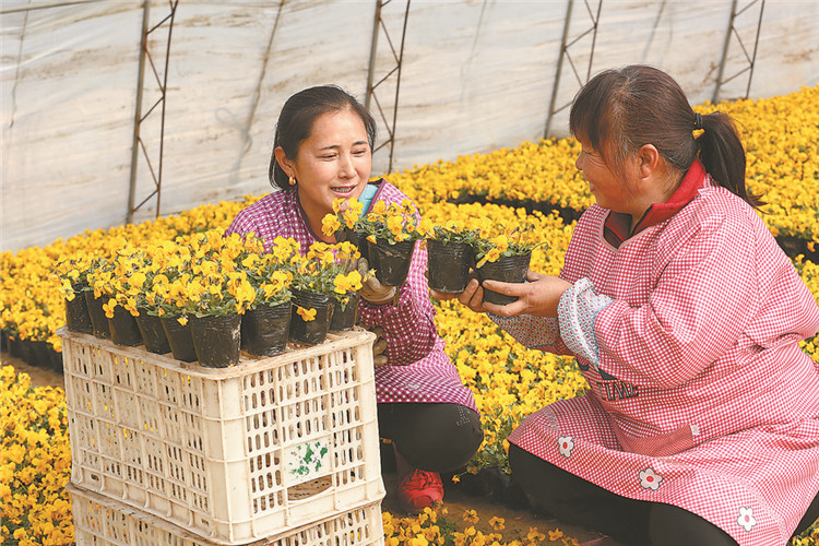 盛園花卉基地,花農(nóng)正在精心挑選南非萬壽菊花苗。