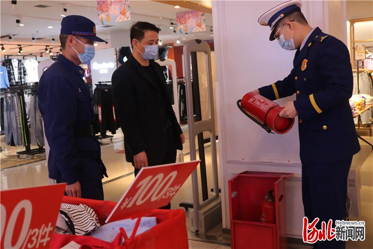 圖為三河市消防大隊監(jiān)督檢查人員對富達購物中心消防器材質(zhì)量情況進行專項檢查。