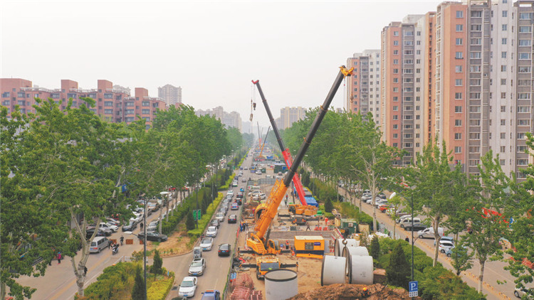 每逢汛期,永興路路段積水嚴(yán)重。廊坊市經(jīng)數(shù)據(jù)分析及專家論證、規(guī)劃,增加下游雨水泵站數(shù)量,提高標(biāo)準(zhǔn)新建雨水管道增大排水容量!霸撀范喂艿篱L6公里,采用雙排3米直徑管道施工,是廊坊市直徑最大的頂管工程!眳强〕山榻B,面對工程規(guī)模體量大、施工難度大,他們克服重重困難,優(yōu)化占路方案,力爭盡早完工。