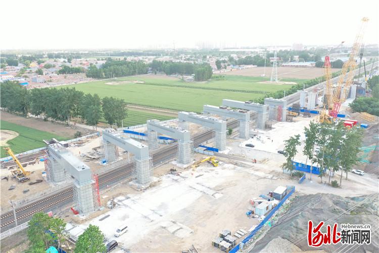 圖為京唐城際鐵路跨燕郊東環(huán)路特大橋門式墩7孔鋼橫梁吊裝施工完成。