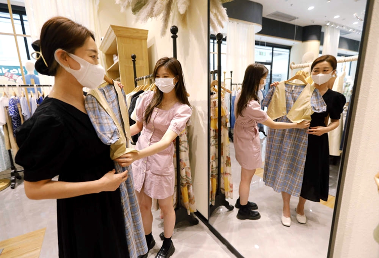 6月6日在永定城·京津冀固安國際商貿(mào)城,一名店員向顧客介紹服裝。新華社記者駱學峰攝