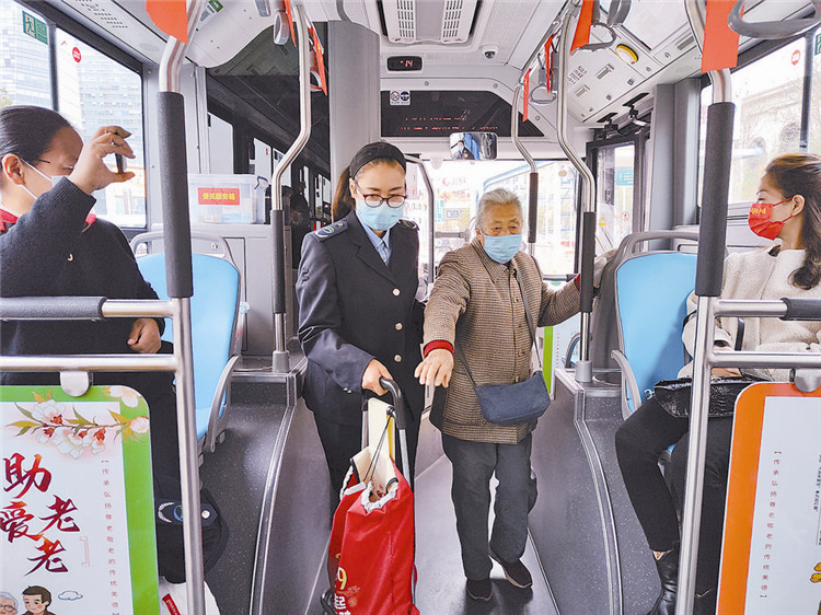 廊坊公交集團(tuán)志愿者為老年乘客提供服務(wù)。記者楊雅淇 通訊員張凡攝