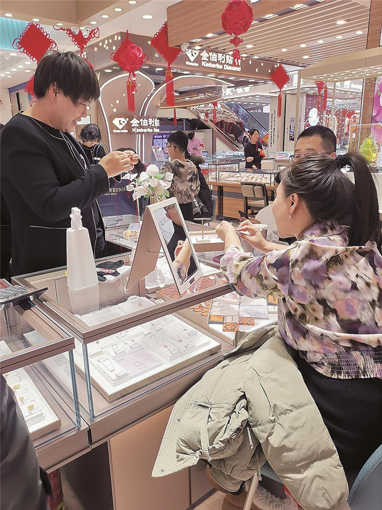 銷售人員介紹,除了買“三金”,還有很多人買黃金送長輩、送子女、送自己,新年圖個好彩頭!拔颐磕甓紩I一件金飾送給女兒,既有過年的氛圍,也能保值增值。”一位正在選購金飾手鏈的市民說。(記者鄭爽)