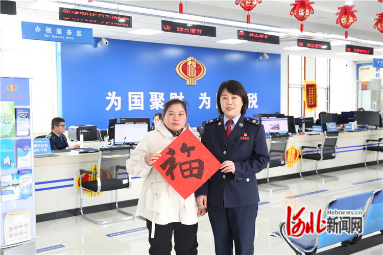 廊坊開發(fā)區(qū)稅務局黨委書記、局長王靜為前來辦稅的納稅人送福字。