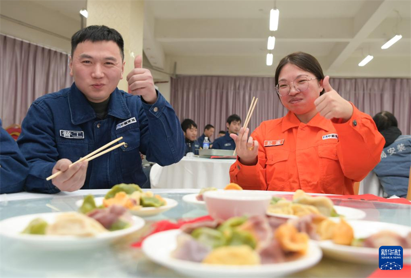 2月2日,在河北廊坊,中建二局安裝公司裝配式事業(yè)部的產(chǎn)業(yè)工人品嘗自己包的餃子。