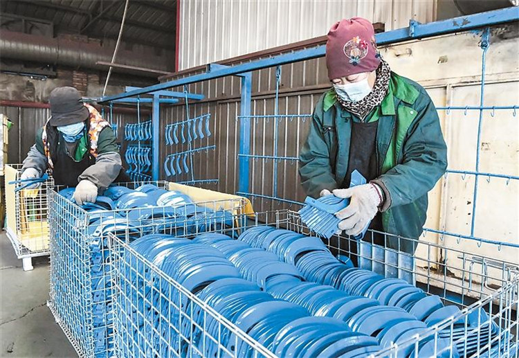 在南趙扶鎮(zhèn)一家農(nóng)機配件企業(yè)生產(chǎn)車間內(nèi),工人檢查調(diào)試產(chǎn)品。