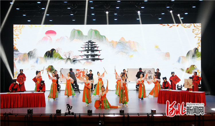 圖為在固安縣大劇院,演員們正在表演書畫創(chuàng)作《墨舞紅龘》。通訊員張思琪攝